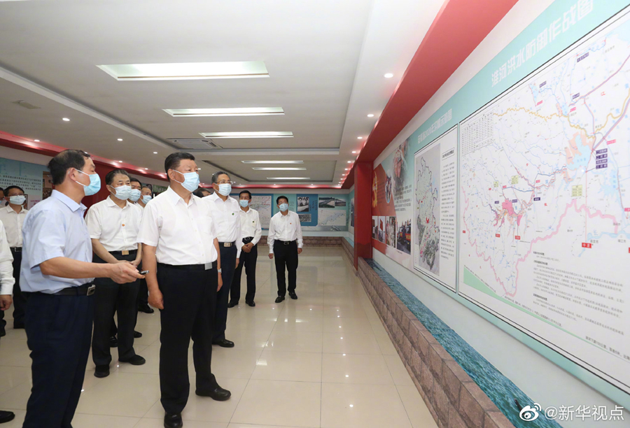 习近平总书记18日赴安徽考察调研。当天下午,他先后来到阜阳市阜南县王家坝闸、红亮箱包有限公司、蒙洼蓄洪区曹集镇利民村西田坡庄台,察看淮河水情,走进田间地头,了解当地防汛救灾和灾后恢复生产等情况,看望慰问受灾群众。(文字记者:张晓松 摄影记者:鞠鹏 王晔)