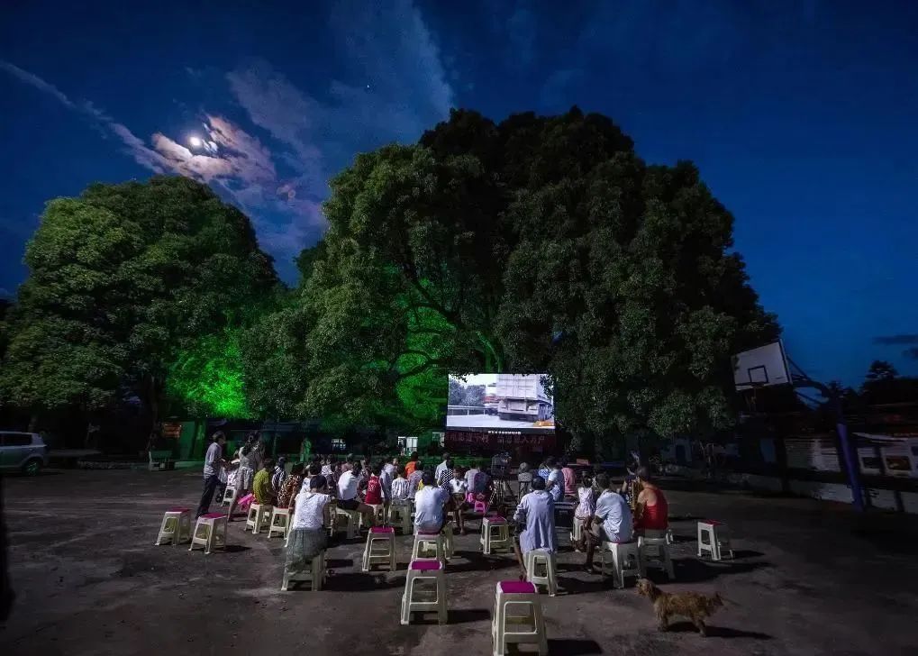 村民在菜花坪镇菜塘村弄堂文化广场观看电影。谭德乐 摄