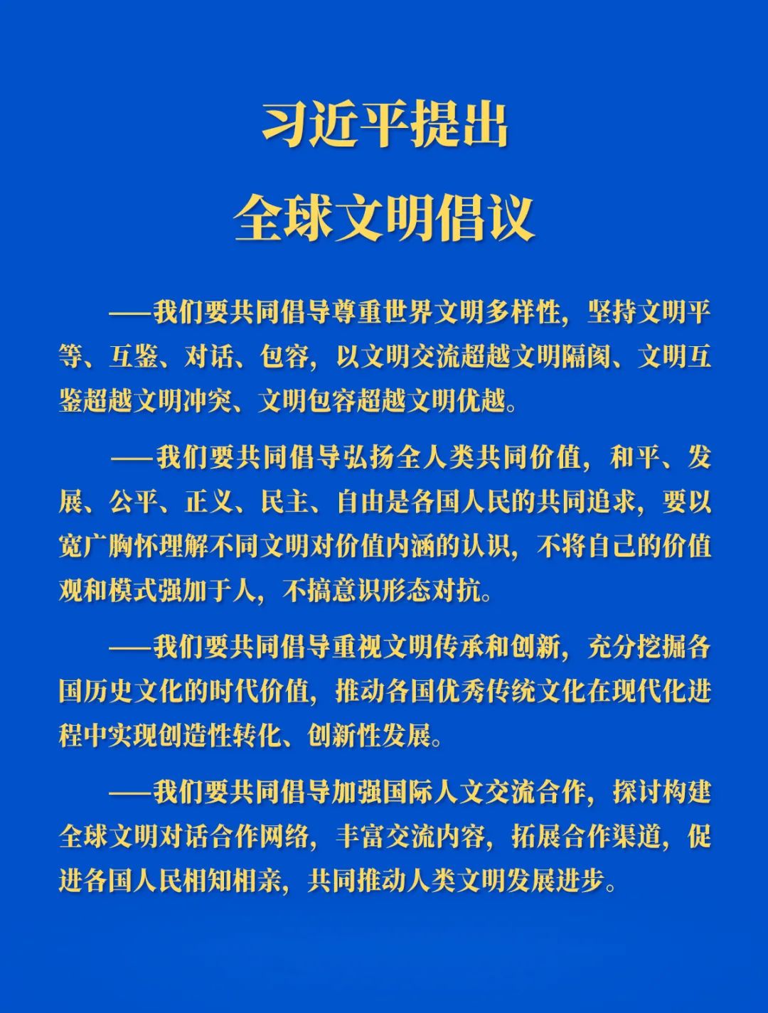 “尊重世界文明多样性”是不同文明包容共存、交流互鉴的前提条件;“弘扬全人类共同价值”为各方提供了根本遵循;“重视文明传承和创新”是文明发展进步的动力源泉;“加强国际人文交流合作”为不同文明相遇相知构建方式路径。
