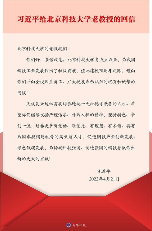 新华社北京4月22日电 中共中央总书记、国家主席、中央军委主席习近平4月21日给北京科技大学的老教授回信,对培养更多高素质人才,促进钢铁产业创新发展、绿色低碳发展提出殷切期望。