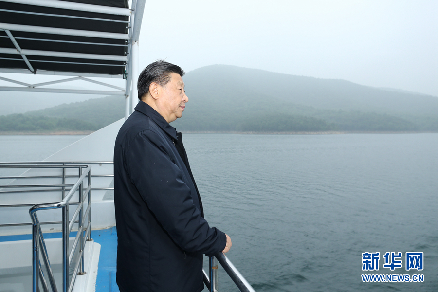5月14日上午,中共中央总书记、国家主席、中央军委主席习近平在河南省南阳市主持召开推进南水北调后续工程高质量发展座谈会并发表重要讲话。这是座谈会前,习近平于13日在南阳市淅川县乘船考察丹江口水库。 新华社记者 鞠鹏/摄