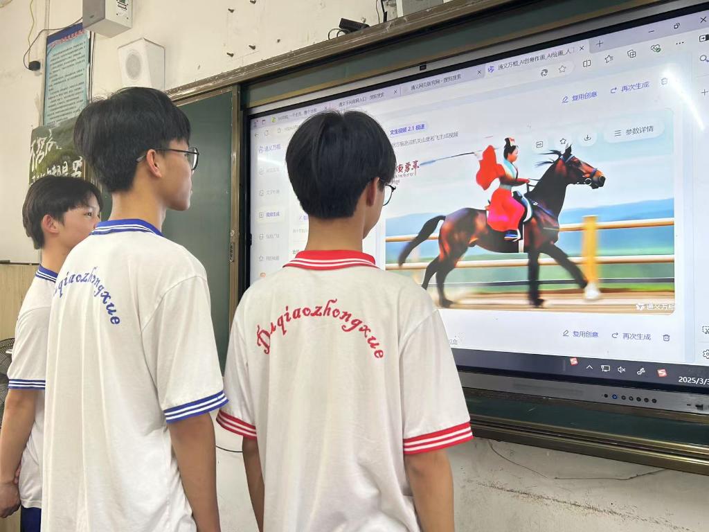 3月3日,广西容县容州镇都峤中学学生观看老师使用人工智能大模型生成的海报,感受语文课堂的互动创新。(陈春仲 摄)