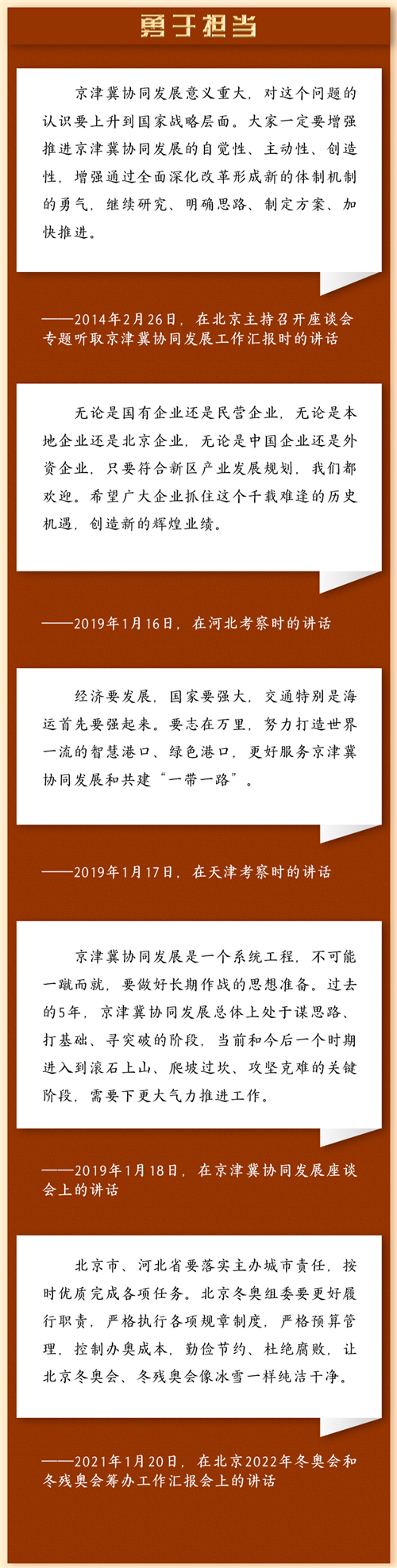京津冀山同脉、水同源、人相亲、地相连,原本就是“一家人”。7年前,习近平总书记站在中国版图前去审视这片广袤大地,作出将“京津冀协同发展”上升为国家战略的重大部署,要求三地“自觉打破自家‘一亩三分地’的思维定式,抱成团朝着顶层设计的目标一起做”。“京津冀协同发展是一个系统工程,不可能一蹴而就,要做好长期作战的思想准备。”“要从全局的高度和更长远的考虑来认识和做好京津冀协同发展工作,增强协同发展的自觉性、主动性、创造性,保持历史耐心和战略定力,稳扎稳打,勇于担当,敢于创新,善作善成,下更大气力推动京津冀协同发展取得新的更大进展。”............7年来,一趟趟调研、一次次论证,总书记跳出“一城一地”得失来思考发展路径,从国家发展全局的高度去擘画和推动,为京津冀协同发展指明方向。如今,京津冀从各自为政、各管一摊,到相互扶持、彼此协助;从发展战略不清、功能重叠,到优势互补、统筹布局……“一加一大于二、一加二大于三的效果”日渐显现。2021年是“十四五”规划开局之年,如何促进京津冀携手下好“一盘棋”,推动京津冀协同发展迈向更高水平?本文特梳理总书记相关讲话要点,与您一起学习。