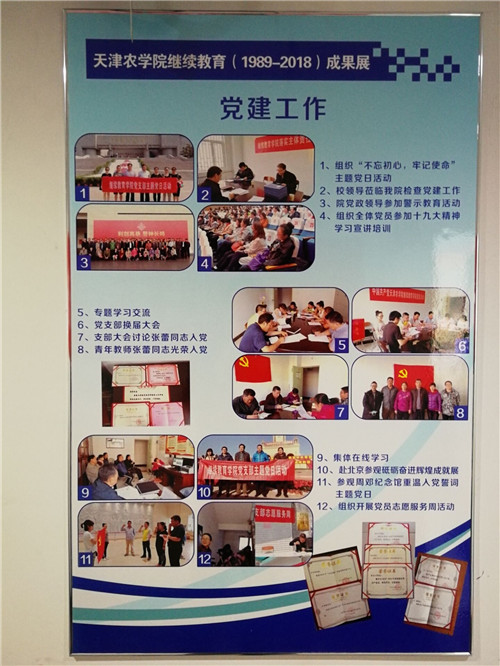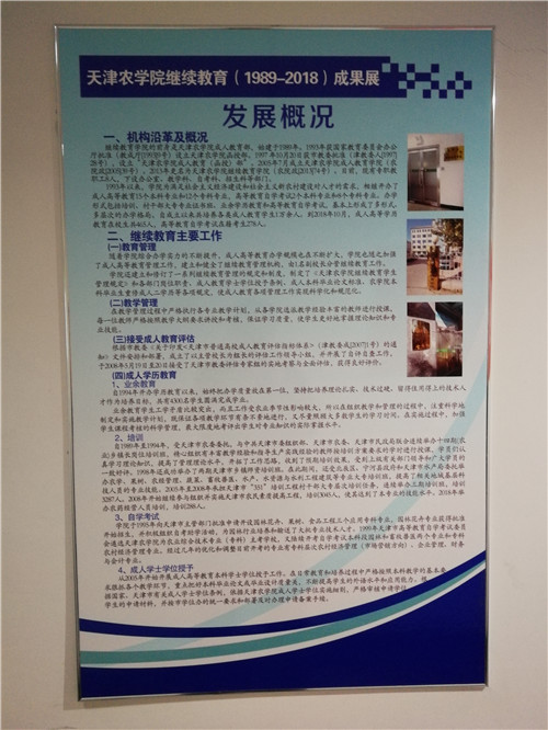 为配合学校开展的第三届校园文化节活动,在校党委宣传部、校办档案室等部门的鼎力支持下,通过挖掘历史图片和档案文件资料,继续教育学院举办了继续教育(1989-2018)成果展。展览分“发展概况”、“人才培养”、“教师风采”、“党建工作”等四个板块,分别介绍了继续教育学院历史沿革,依托学校办学资源,服务“三农”,积极开展成人学历教育、高等教育自学考试和专项培训等工作,展示了在人才培养等方面取得的成果和教师队伍代表的风采,以及落实全面从严治党主体责任开展的党建工作。