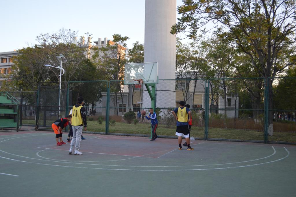 本次篮球比赛由王闯、王大海两位老师主要负责本次比赛的组织举办等事宜,并担任指导教师和比赛裁判。比赛共9个学院近80人报名参加,每周一、三、五利用课后时间进行比赛,为提升效率,每天两场比赛同时进行。