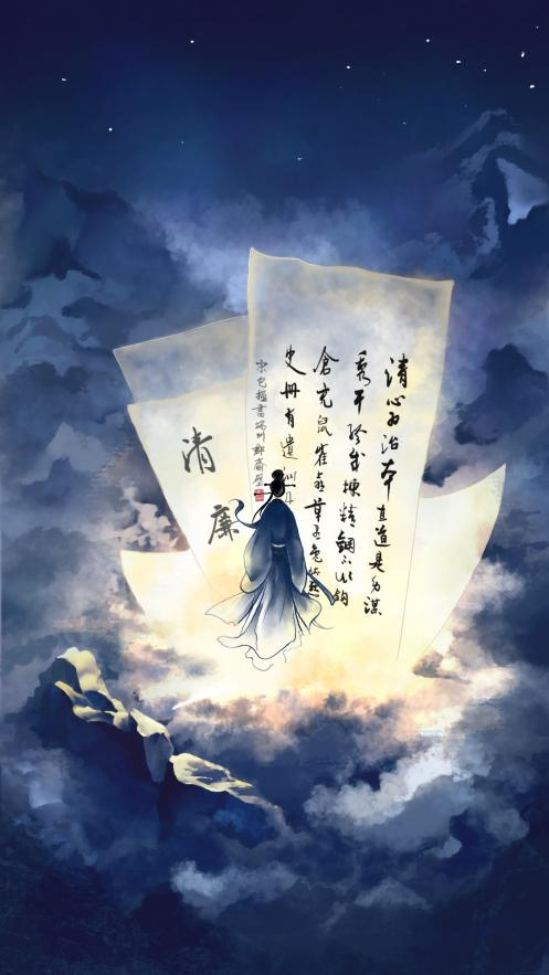 这幅作品以云海山峦为幕,借古风人物、书法长卷诠释清廉。“清心为治本,直道是身谋”的诗句与 “清廉” 题字相衬,颂清正之风,传廉洁之魂,启人坚守清廉本心。