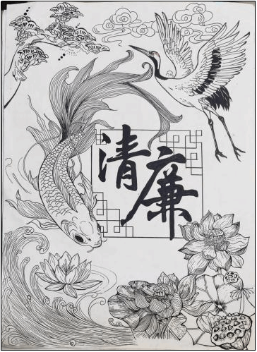 这幅线描作品以“清廉”为核心,借荷花(喻纯洁)、锦鲤(喻坚守)、仙鹤(喻高洁)等传统意象,辅以祥云纹饰,通过细腻线条将清廉内涵具象化,既显艺术精巧,又颂清正之风、传廉洁之美。