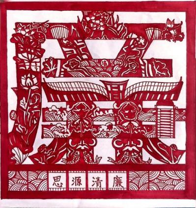 这幅剪纸作品以“廉”字为核心造型,融合多种廉洁意象。左侧的荷花象征“出淤泥而不染”的清廉品格;中间的建筑、水纹等元素寓意廉洁文化的传承与滋养;底部“思源清廉”四字点明主题。整体以传统剪纸的红韵之美,将廉洁内涵具象化,既展现民间艺术的精巧,又以丰富的符号语言,颂清廉之风,传思源之理,让廉洁文化在红纸镂空间熠熠生辉。