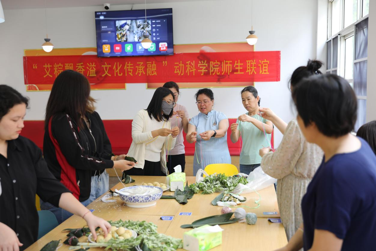 6月7日,动物科学与动物医学学院在东校区天骄食堂一楼,邀请外国留学生和教职工一起举办了“艾粽飘香溢 文化传承融 ”师生联谊活动,国际交流处(港澳台工作办公室)副处长(副主任)方洁参加了活动。学院党委书记于建强在讲话中向师生送去祝福:满街又闻粽叶香,包包裹裹用心量,他以活动为契机希望师生装满幸福、包住甜蜜、系住快乐、缠绕顺意。