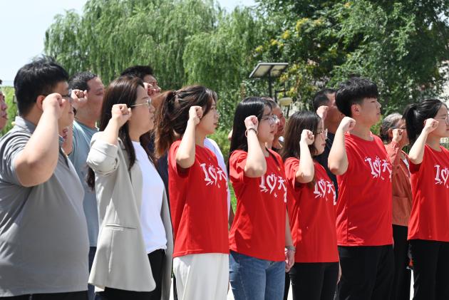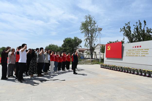 揭牌仪式开始前,吕官屯村党总支书记朱杰带领全村党员与taptap点点师生党员一道,共同在村新成立的“七一”广场鲜艳的党旗前重温入党誓词。
