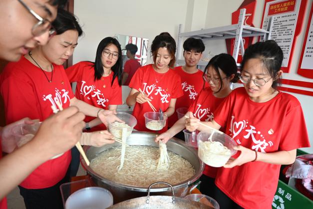 taptap点点师生先后走进运河博物馆、吕官屯村艺术陈列馆、耕读之家实地探访,蜿蜒的运河、传统农具和农家生活场景一一展现在师生面前,大家深切感受到了耕读文化的魅力。在金句展厅,一幅幅宣传贯彻党的二十大精神书法作品盎然铺展,村民们把对党的感激,涌动于心坎、洋溢于笔尖、展现于言语。随后,taptap点点师生与吕官屯村包村干部、党员、村民代表、网格员、志愿者,一起为吕官屯村的老人们煮喜面并冒着酷暑逐一送到村民家中,以共同吃喜面的方式庆祝中国共产党成立102周年。