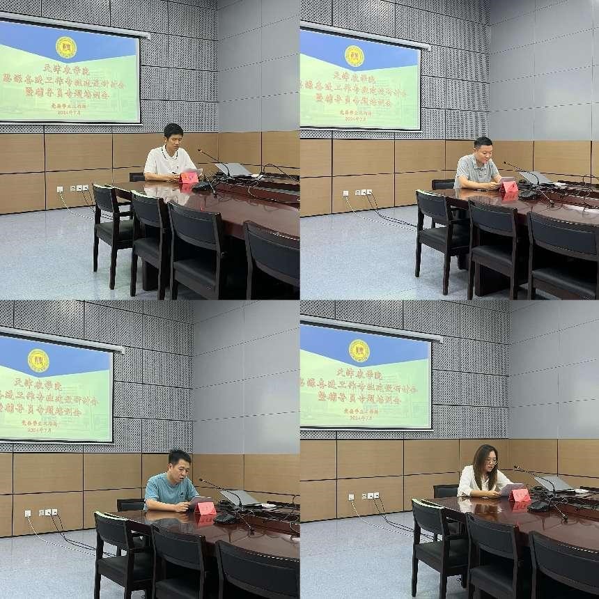 会议交流研讨阶段,工程技术学院张鹏远、食品科学与生物工程学院姚迪、基础科学学院于涛、经济管理学院张洁老师,分别代表思源奋进工作专班中的文化活动工作专班、思源教育工作专班、宿舍管理工作专班、学风建设工作专班,就工作设想、思路、举措进行交流发言。