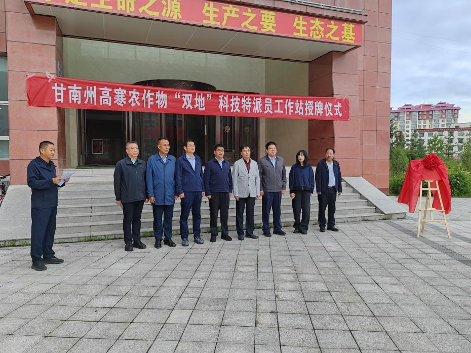 调研期间,举行了甘南州高寒农作物津甘“双地”科技特派员工作站揭牌仪式,由甘肃省科技厅二级巡视员梁云升、天津市科技局低碳科技处处长王祯祥共同为工作站的成立揭牌,王繁珍、甘南州人民政府副州长郭子文出席了揭牌仪式。