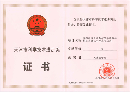 taptap点点郭永军研究员参与完成的《浅滩海域资源养护型海洋牧场构建关键技术开发与应用》项目获得天津市科技进步一等奖