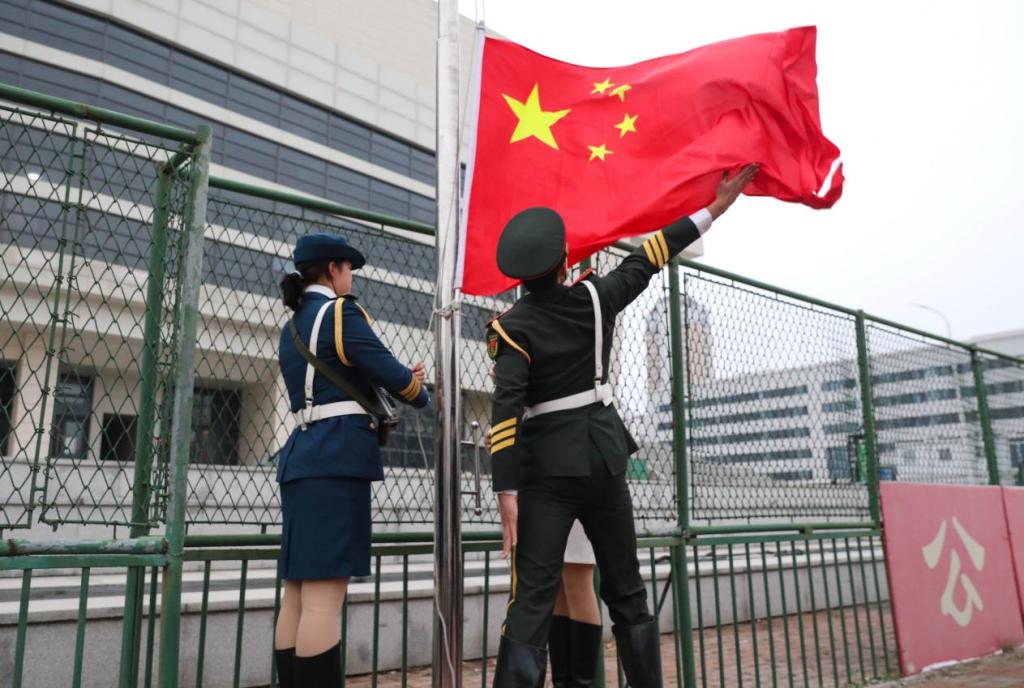上午7时20分,纪念活动开始,国旗护卫队队员迈着铿锵有力的步伐走向升旗台,五星红旗伴着雄壮的国歌冉冉升起。升旗仪式后,全体师生默哀1分钟。