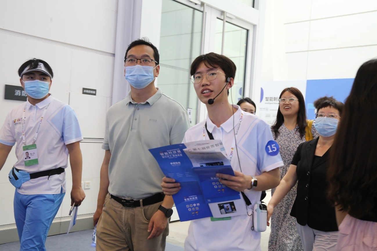 在智能制造展区、人工智能展区,专业团组讲解员吴毓科和于潇洋详细向金危危一行介绍了“仿生人形机器人”“AI书法机器人”等板块,并表示非常珍惜大赛组委会和学校提供的志愿服务机会,将持之以恒、精益求精地做好志愿服务。