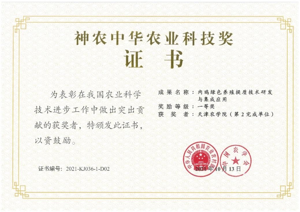 学校荣获全国农牧渔业丰收奖、神农中华农业科技奖、天津市科技进步奖