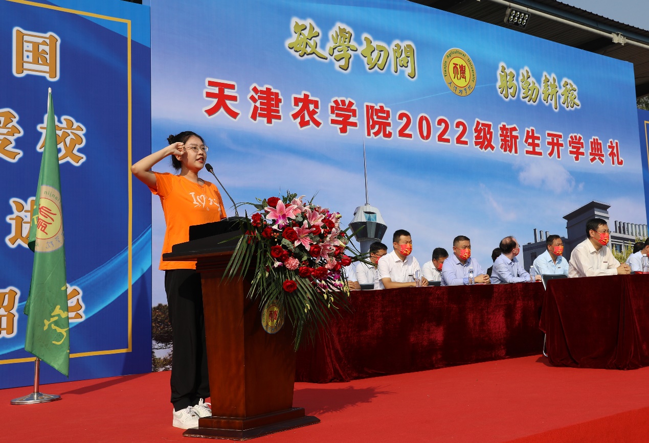 2022级水产专业硕士研究生李浩程同学带领全体新生入学宣誓,誓以成为天农人而自豪,爱党爱国爱农爱校,将小我融入大我,思源奋进,做德智体美劳全面发展的社会主义建设者和接班人,为乡村振兴,实现中华民族伟大复兴的中国梦奉献青春力量。