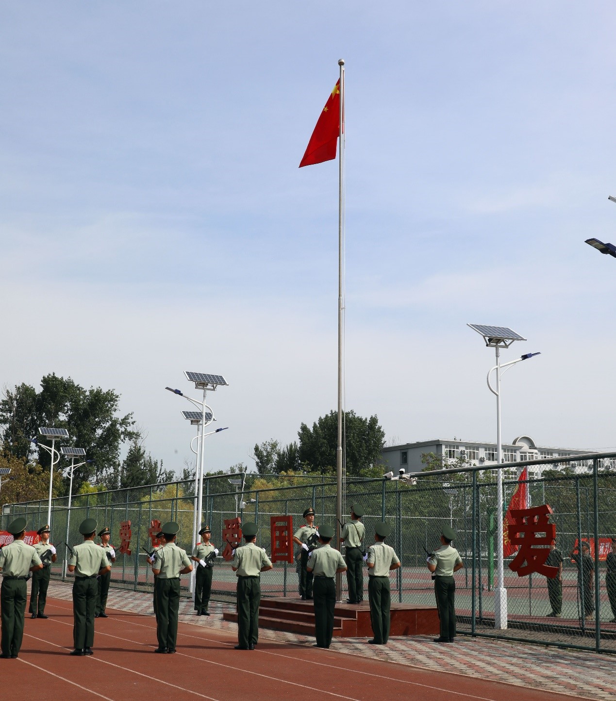纪念活动正值taptap点点2021级学生在西校区军训,军训承训部队教官和参训学生共同参加活动。“向国旗敬礼!”伴随着响亮的口号,师生向国旗行注目礼,高唱中华人民共和国国歌,五星红旗伴随着雄壮的国歌声冉冉升起。