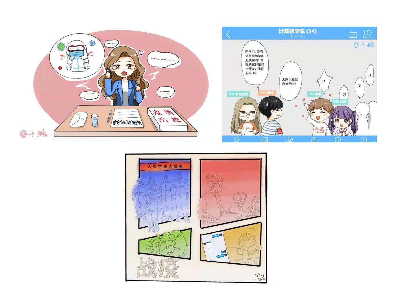 辅导员们将疫情防控与价值引领相结合,进一步加强学生爱国主义教育。加强防疫知识宣传,引导学生正确看待疫情,遵守属地防疫要求,不传谣不信谣。院学生会干事周洁和于璐同学看到辅导员、班主任和学生干部的辛苦付出,用漫画的方式倡议全体学生积极配合老师们开展相关工作,主动报备各类信息。