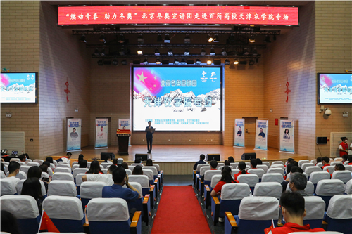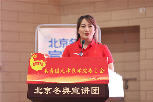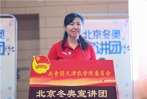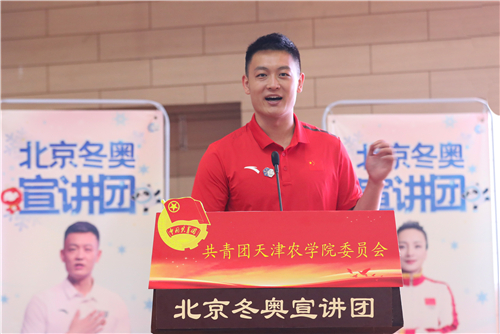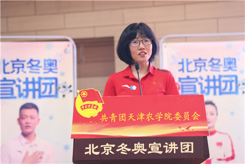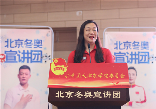 宣讲员个个感人至深、振奋人心的冬奥故事,深深触动着在场每一位天农师生的内心,掌声经久不息。有参加韩国平昌冬奥会闭幕式北京8分钟表演的南开大学青年教师郭露阳,以精湛的表演向全世界发出来自中国的诚挚邀请。有结下“冰雪良缘”的北京市东城区龙潭街道龙潭北里社区副主任王波,分享了自己2017年取得北京大众滑雪六级证书,并以冰雪为媒收获爱情,与先生共同从滑冰爱好者到滑雪战队首批队员,致力弘扬奥运和平、发扬志愿者精神的动人故事。有收集冰雪剪报20年、普及冬奥文化的中国铁路北京局集团有限公司塘沽站工程师王蓬,他参加《冬奥达人答》,创作冰、雪诗词飞花令,用自己的全部热情普及冰雪知识。有坚守幕后、打造奥运“超级现场”的中国联通北京分公司冬奥办公室主任张嘉,为我们讲述了《智慧冬奥联通未来》的幕后故事。有我国第一代滑雪医生中国中医科学院西苑医院医生付妍,为我们展示了一名滑雪医生炼成背后的执着坚守和辛苦付出。有自由式滑雪空中技巧世界冠军李妮娜,对运动的热爱和坚持不懈的精神早已是她人生的金牌,索契冬奥会后,她依然留在了离冬奥最近的地方,为北京冬奥组委运动员委员会贡献力量,在2015年7月31日的吉隆坡,李妮娜作为运动员代表进行全英文申奥陈述:“我把青春奉献给冬奥、奉献给我的国家。”她用《两块“金牌”的故事》讲述冠军背后的体育故事、传递中国体育精神。