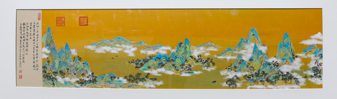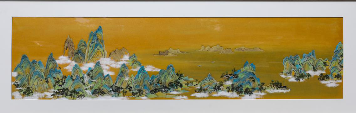 压花作品“千里江山”完全采用植物材料制作,运用现代艺术创作手法将我国宋代著名山水画家王希孟传世作品《千里江山图》表现得淋漓尽致,作品富含中国传统审美意蕴,展现出祖国大好山河。