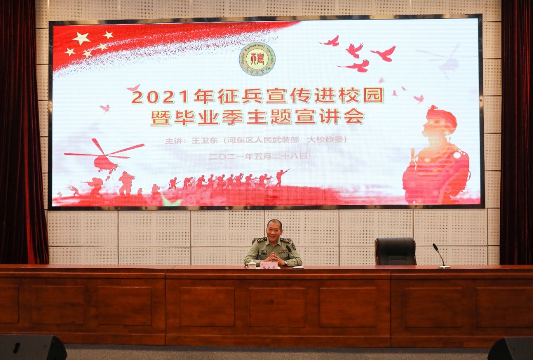 王卫东从军队的地位与作用、征兵工作特别是高校征兵及高校征兵工作的思考等三个方面展开宣讲。他分析了当前国际形势、安全形势,指出军队建设的重要意义并从就业、学业保障、个人成长等方面系统、全面的讲解了高校征兵保障政策。他指出,作为征兵工作的组织发动者,要懂政策,要能讲清楚政策;要抓住学生关注点,解疑释惑;要做好服务保障工作。同时,他鼓励更多大学生能投身军营,接受部队教育锻炼,建功国防事业。