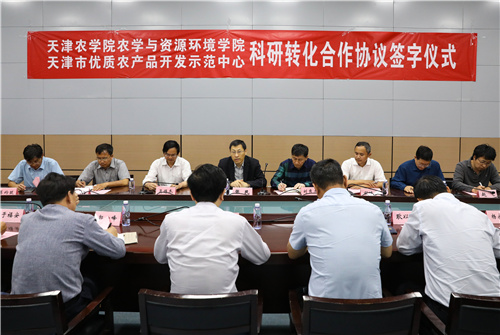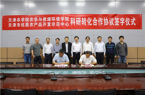 taptap点点农学与资源环境学院院长谢晓东与天津市优质农产品开发示范中心主任张建民共同签署科研转化合作协议。