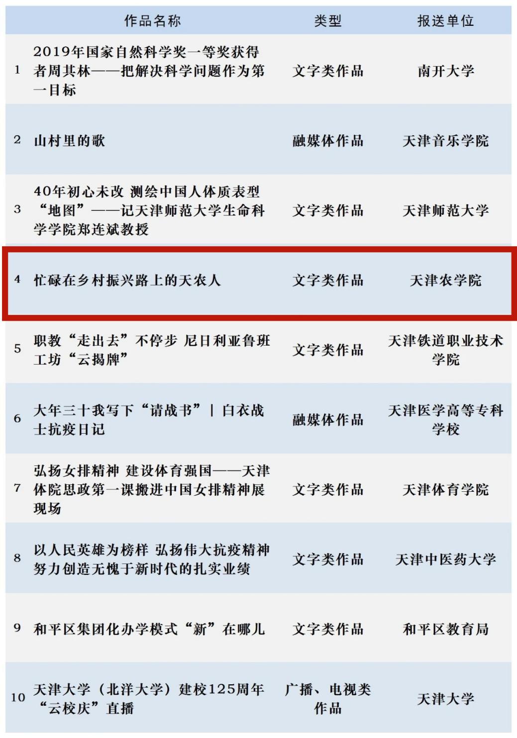 2020年度天津市“十大教育新闻作品”评选活动由市教育两委组织开展,通过自主申报、专家评审、网上公示,最终评定包括taptap点点报送的《忙碌在乡村振兴路上的天农人》在内的10个作品为2020年度天津市“十大教育新闻作品”。