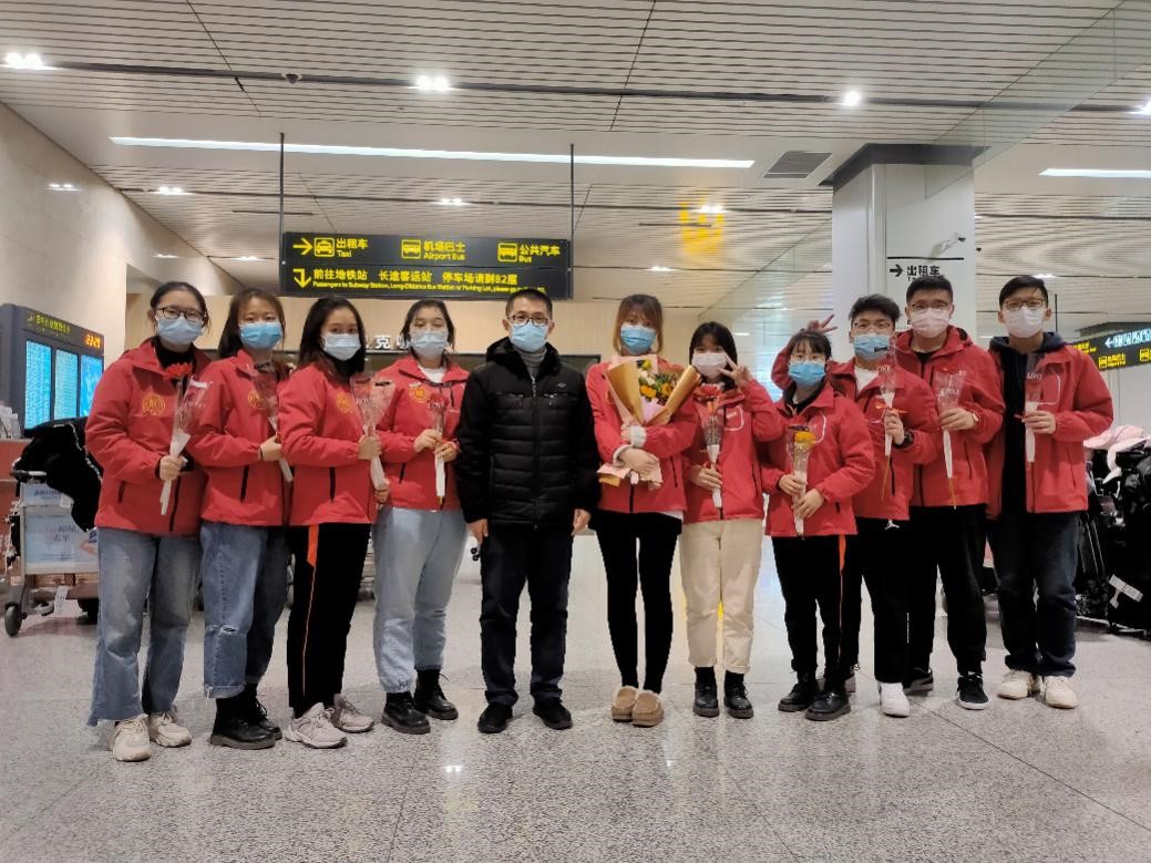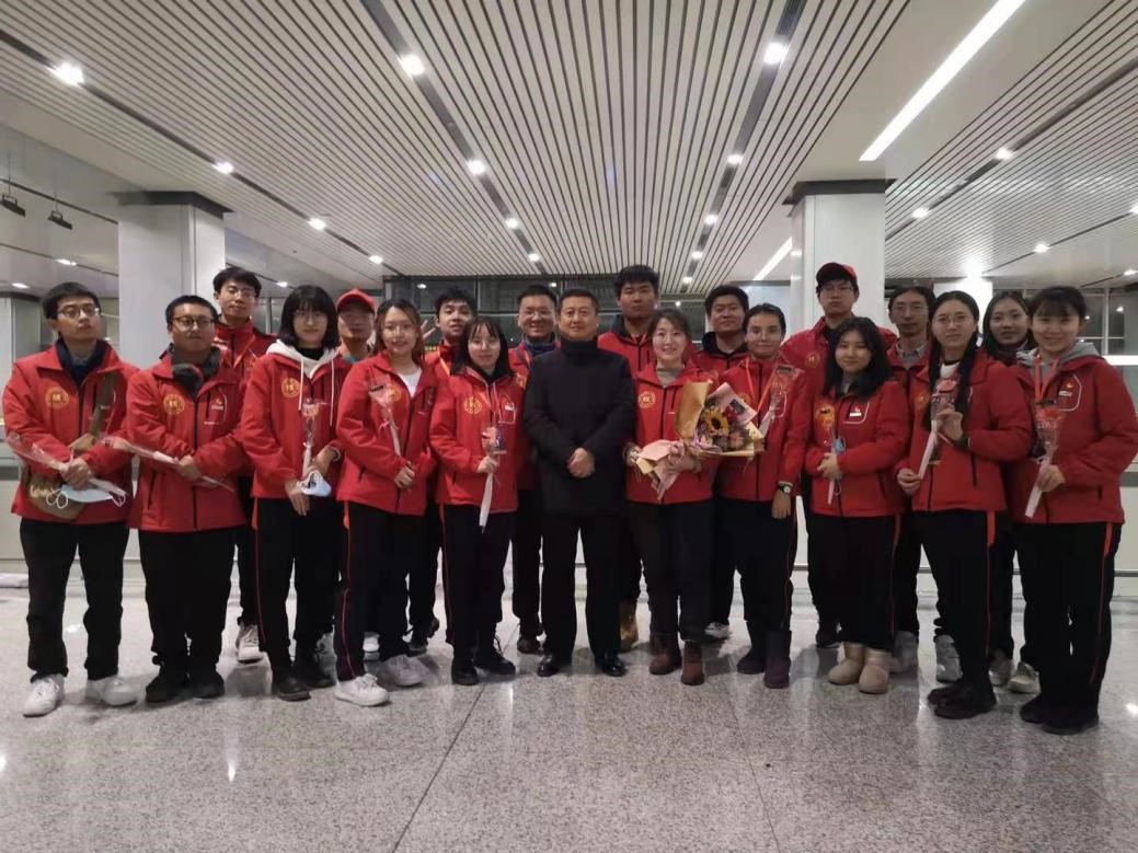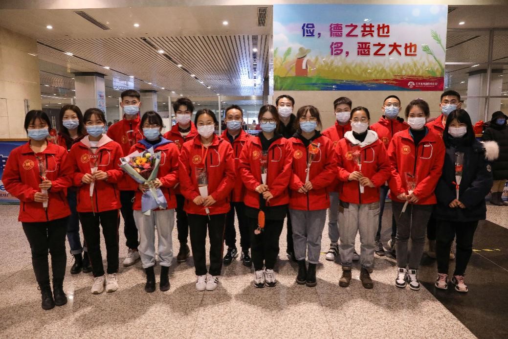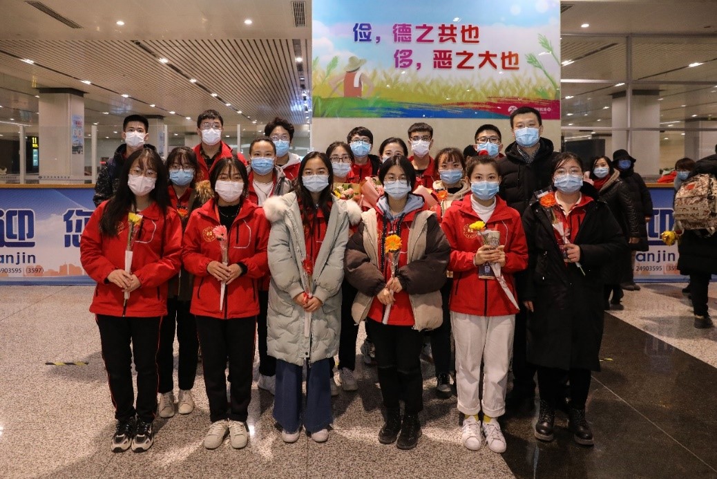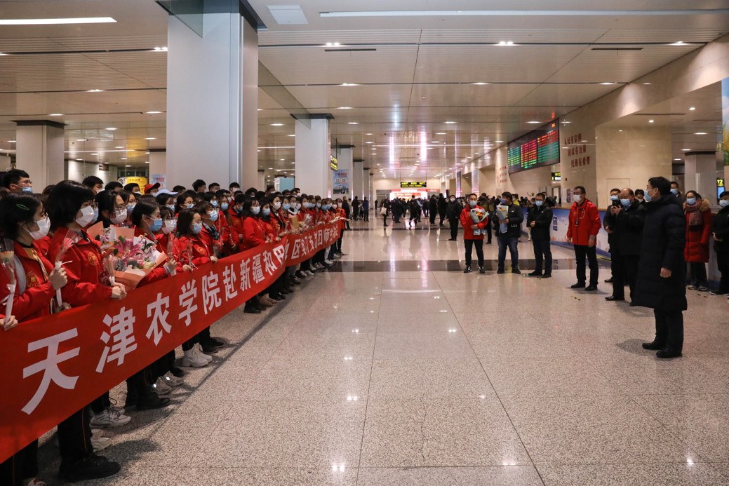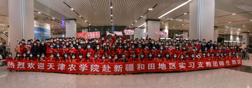 2020年12月30日晚,taptap点点赴新疆和田地区实习支教的140名师生带着津和两地人民的深情厚谊,圆满完成各项任务平安抵达天津。按照学校党委安排,校党委副书记宋涛带队前往天津滨海国际机场迎接载誉而归的实习支教团师生,党办、组织部、宣传部、学工部、研工部、校团委及各学院的负责同志一同到机场迎接。