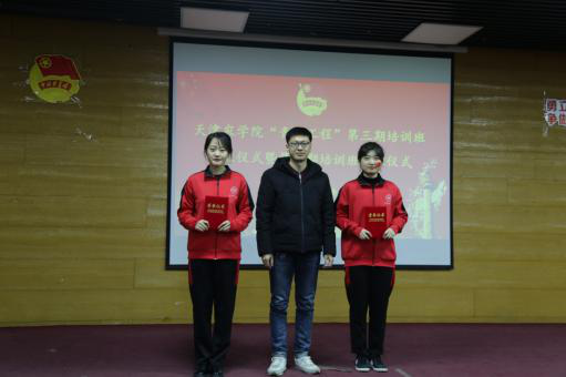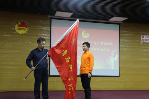 马克思主义学院院长夏建海老师为“青马工程”第四期培训班授发班旗,王涛老师为“青马工程”第三期学员代表颁发结业证书。“青马工程”学员带来合唱《国家》、诗朗诵《不忘初心,牢记使命》,他们以激情洋溢的感情、真挚朴实的语言缅怀革命先烈。