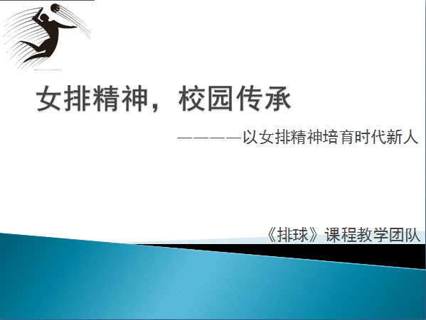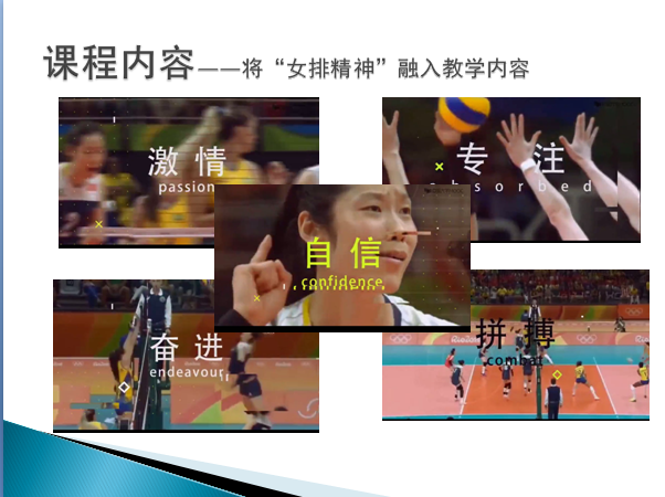 挖掘课程思政元素,凝练女排精神,将女排精神融入培养目标。女排精神是对中国女子排球队顽强战斗、勇敢拼搏精神的总概括,其具体表现为:扎实肯干,吃苦耐劳,无所畏惧,顽强拼搏,团结合作,自信专注,勇攀高峰,爱国情怀。从时代发展需要出发,将女排精神融入课程培养目标,构建新“体育课程五大领域培养目标”,培养学生健康体魄的同时更加注重爱国情怀、拼搏精神的培养,引导学生把个人理想与国家命运紧密相连,成长为担当民族复兴大任的时代新人。