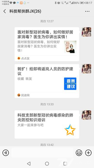 园艺园林学院杨静慧教授自1月5日以来,为其对接的蓟州、宁河等6个区的120余名农户建立科技帮扶微信群,通过放映课件、语音答疑、视频会议等方式向农户传播先进的果树整形采摘技术、生态建园理念、病虫害绿色防治要点等内容,同时针对生产中的实际问题逐一答疑解惑,让农户们在这个特殊的春节,足不出户就能收获和积累农业生产最前沿的知识和讯息,为2020年春种做好充足的准备。与此同时杨教授通过科技帮扶微信群向农户宣传疫情防控的最新知识,引导广大农民科学防控,理性应对,不信谣,不传谣,用实际行动抗击疫情。