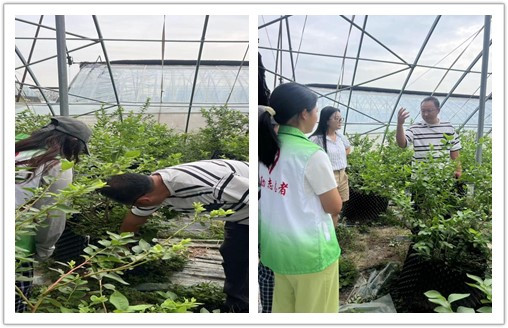 当日下午,志愿服务队来到辛口镇岳家开村开心家庭农场蓝莓基地进行考察实践。蓝莓种植技术老师冯爱喜对同学们的到来表示热烈的欢迎,并讲解了富硒蓝莓的品种、特性、栽培要点、产销流通渠道等。