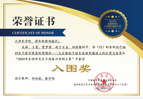 另外,该团队研究生(吴薛、王慧、曹梦哲、赵于玄益、田娇娇)获得“2024年全国研究生乡村振兴案例大赛”入围奖(403个案例208个入围),彰显了学生综合素质和实际应用能力的培养成效;团队研究生吴薛和田娇娇撰写的研究论文《植物提取物与酿酒酵母发酵饲料的筛选研究》在第九届京津冀畜牧兽医科技论坛上荣获优秀奖,展现了团队学生在学术创新研究方面的成绩。