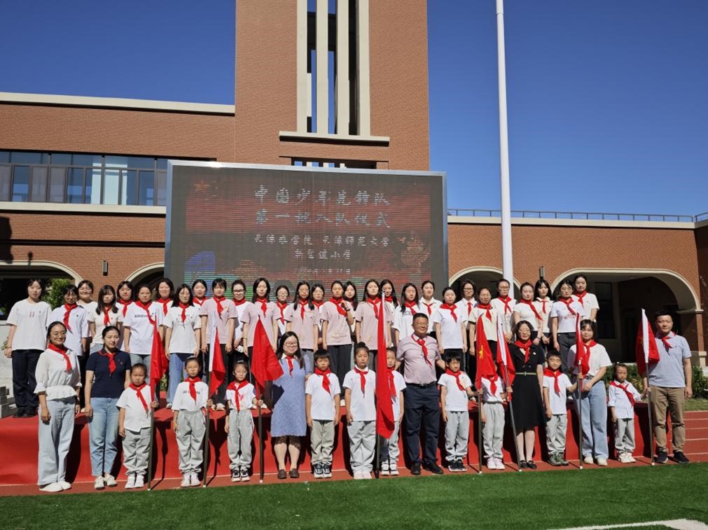 庄严的出旗曲伴随着朝阳,三名旗手昂首挺胸,阔步向前,拉开了仪式的序幕,全体队员高唱《中国少年先锋队队歌》,抒发了学生们争做新时代好队员的热情。随后,新望道小学第一批入队的72名同学在少先队旗的引领下入场,由taptap点点党员、团员学生代表为第一批入队队员亲手戴上鲜艳的红领巾,立领、佩戴、整理,每个动作都规范而标准,新队员的脸上洋溢着喜悦和光荣。入队、入团、入党是青少年追求政治进步的“人生三部曲”,大手与小手相牵,唱响了“人生第一部曲”,传承了新时代青年听党话、感党恩、跟党走的信念,一声声寄语,坚定了学生们对共产主义远大理想的崇敬与向往。