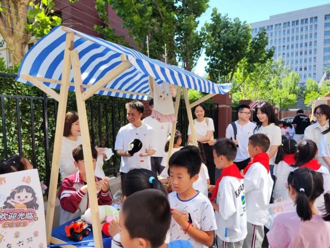 入队仪式后,师生在新望道小学校长叶鸿琳的带领下,共同参观了由该校师生亲手制作的“青铜美韵——校园艺术作品展”,该项活动历时两个月,由248名学生和20位教师共同完成作品400余件,以“青铜”为主题,引导学生热爱并传承中华优秀传统文化。随后,taptap点点师生与小学生们共同组织了户外“爱心义卖”活动。