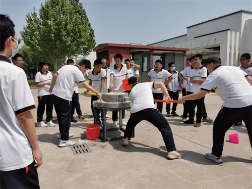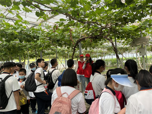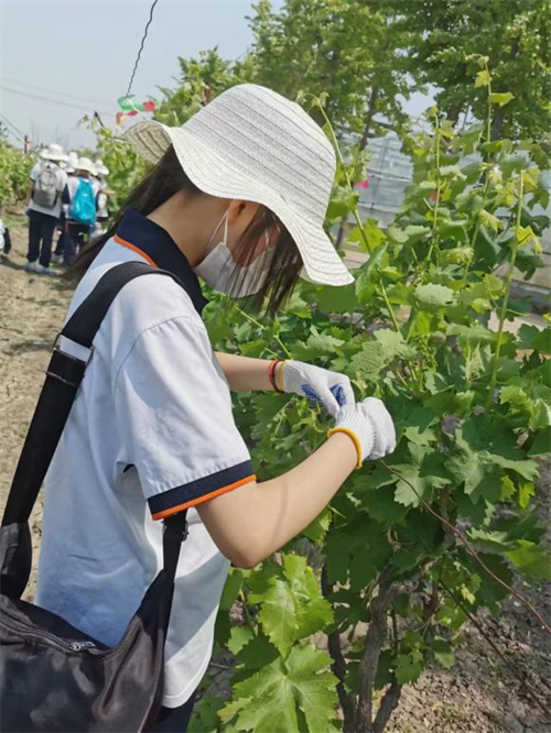 在磨豆浆体验基地,经过讲解员老师的悉心指导,同学们了解了制作豆浆的全过程,感受到通过劳动获得食物的乐趣。露天篱架栽培葡萄园里的葡萄已进入盛花期,学生们在这里进行除草、绑蔓的农耕体验,他们小心翼翼地操作着,耐心将每一条嫩绿的枝蔓绑好固定,以便其更好地生长。随后学生们来到葡萄温室大棚进行参观,学习葡萄生长发育的物候期、葡萄品种等知识,掌握了“果实表皮的白霜可否食用”、“无籽葡萄的由来”、“葡萄的用途”等葡萄生产生活小知识。
