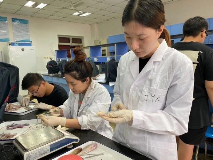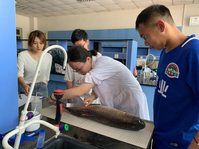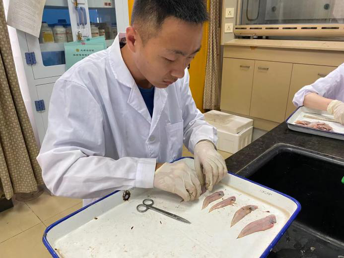 躬勤楼214实验室,白东清教授等课题组,主要研究饲料营养与功能。学生们正在开展不同饲料投喂鱼后的一些外观及分子变化的检测的相关实验。