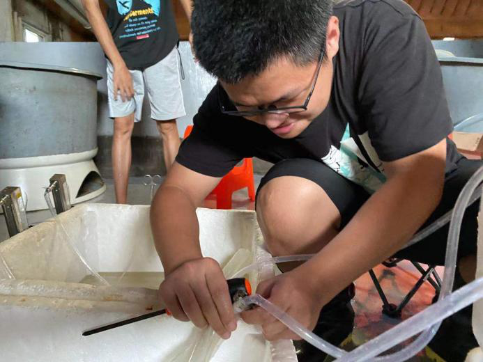 陈成勋研究员的学生正在为观赏鱼企业做技术服务。