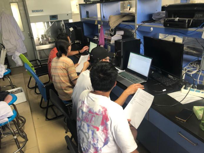 躬勤楼209实验室,陈成勋研究员等课题组的研究生们正在进行养殖尾水的指标检测,着力于脱氮除磷功能微生物研究。