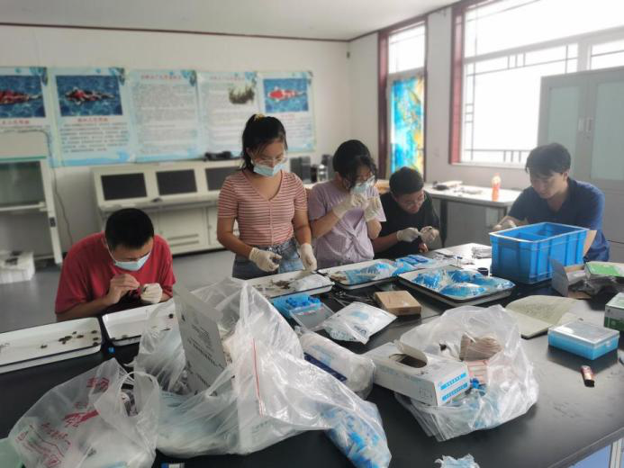 在宝坻区水产养殖基地,周文礼研究员的课题组,主要研究生物饵料开发与应用,窦勇老师和同学们正在养殖基地解剖学生暑假养殖的河蟹进行取样。