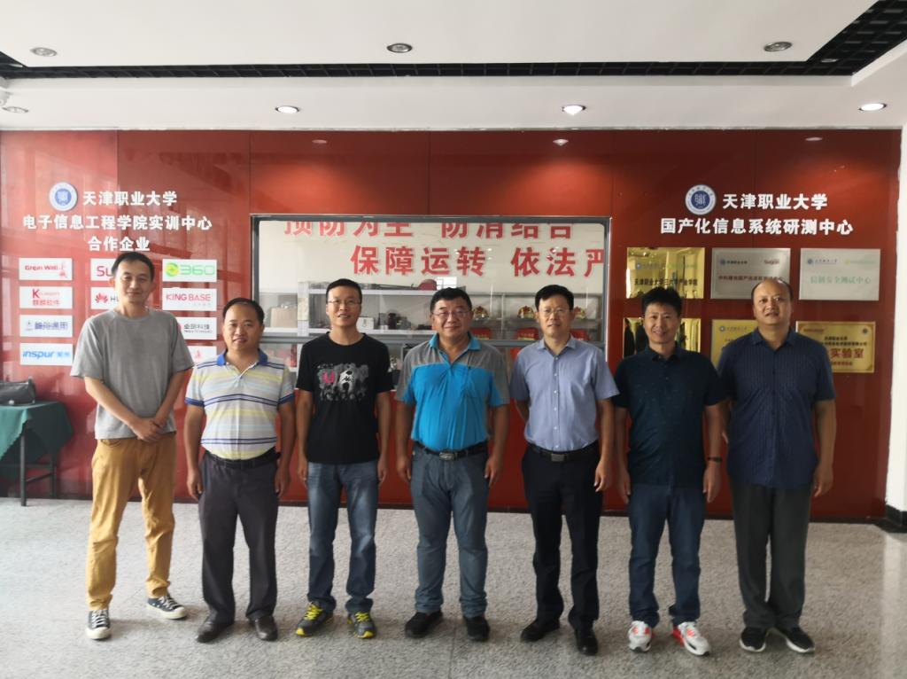 刘同海一行在天津职业大学电子信息工程学院院长王翔、副院长时瑞鹏的陪同下参观考察了实训中心的实训基地,天津职业大学的同行演示了目前正在使用的基于海思处理器和麒麟操作系统的实训平台软硬件系统,就国产CPU和操作系统与国外CPU和操作系统性能比较进行了介绍。