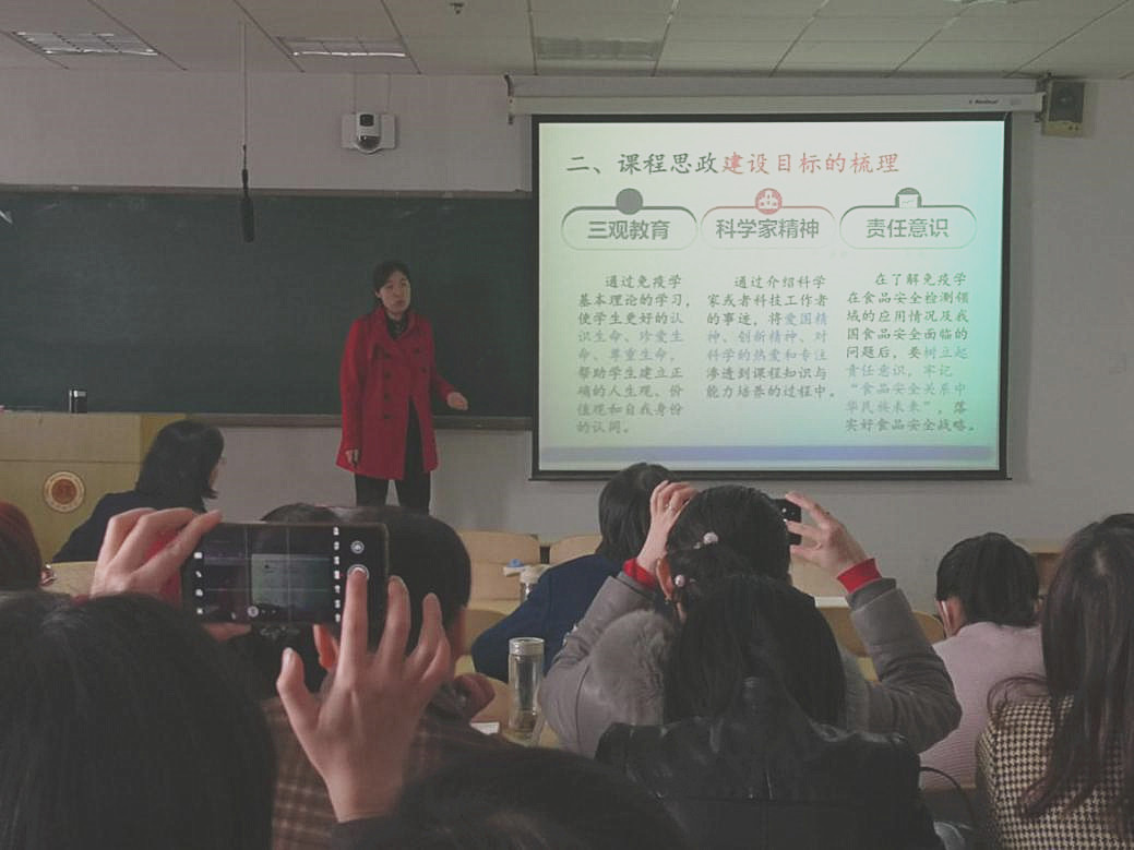 食品科学与生物工程学院教师尤玲玲以承担的《食品免疫学》为例进行了课程思政经验交流。尤老师把课程内容挖掘筛选出15个思政要素,并凝练出“三观教育”“科学家精神”和“责任意识”的课程思政目标,围绕目标案例说明思政教学的设计思路和实现途径。