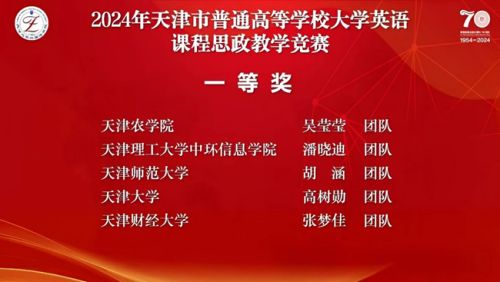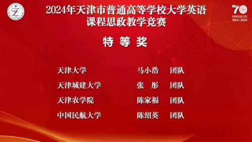 近日,天津市普通高等学校大学英语课程思政教学竞赛决赛在天津大学北洋园成功举行并圆满结束。taptap点点参赛的两个教学团队在比赛中表现出色,取得优异成绩,其中,陈家福老师教学团队(成员:李然、韩晓洁)荣获特等奖,并将代表天津市参加全国外语课程思政优秀教学案例征集与交流活动;吴莹莹老师教学团队(成员:刘丽萍)荣获一等奖。
