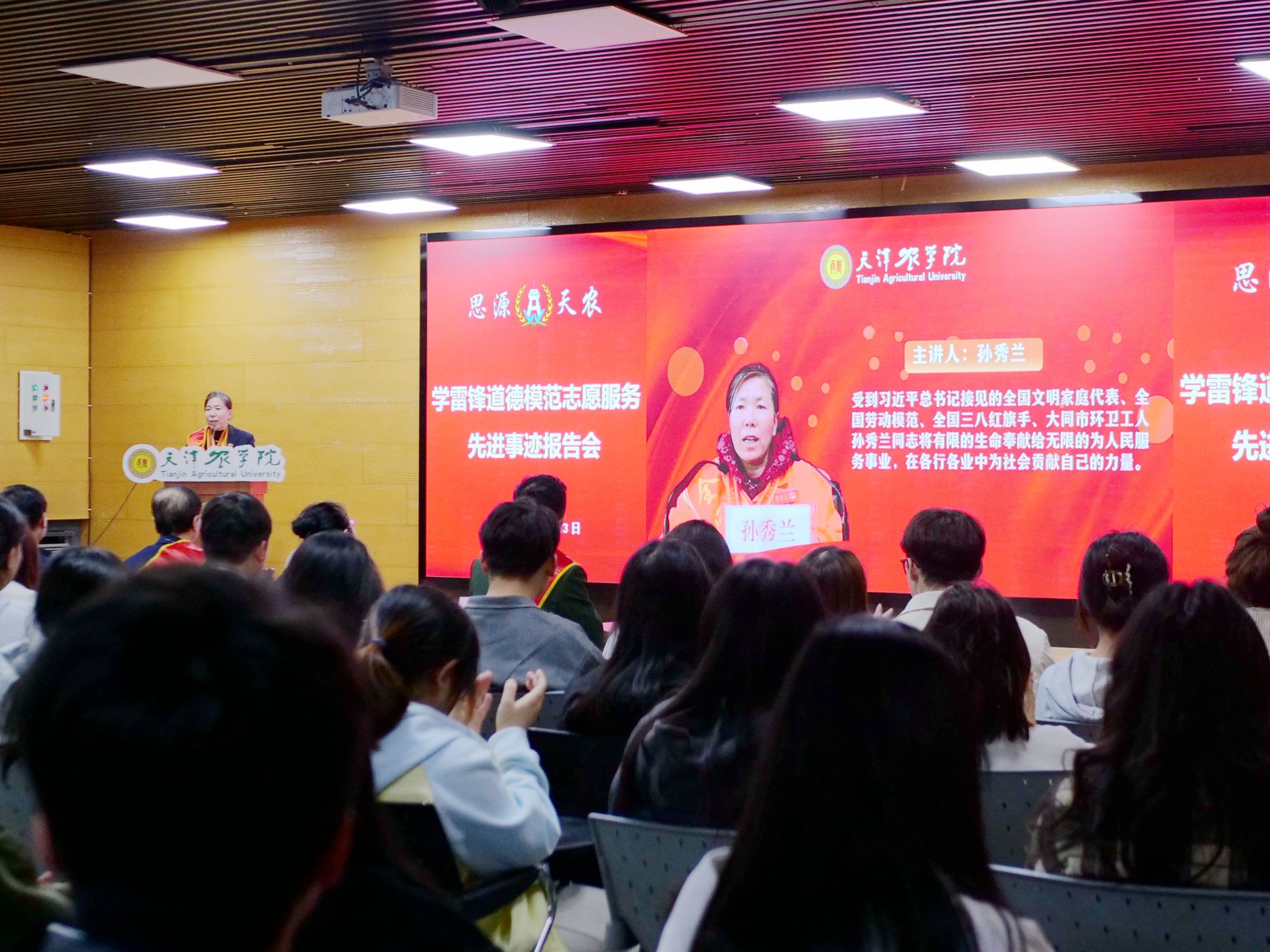 全国劳动模范、全国三八红旗手、大同市环卫队队长孙秀兰同志以《三代奉献环卫工,学习雷锋献爱心》为题作报告,孙秀兰同志曾受到习近平总书记接见,她以“一把扫帚传三代”的家风传承故事启发同学们将志愿服务融入日常生活,从一点一滴的小事做起践行雷锋精神。