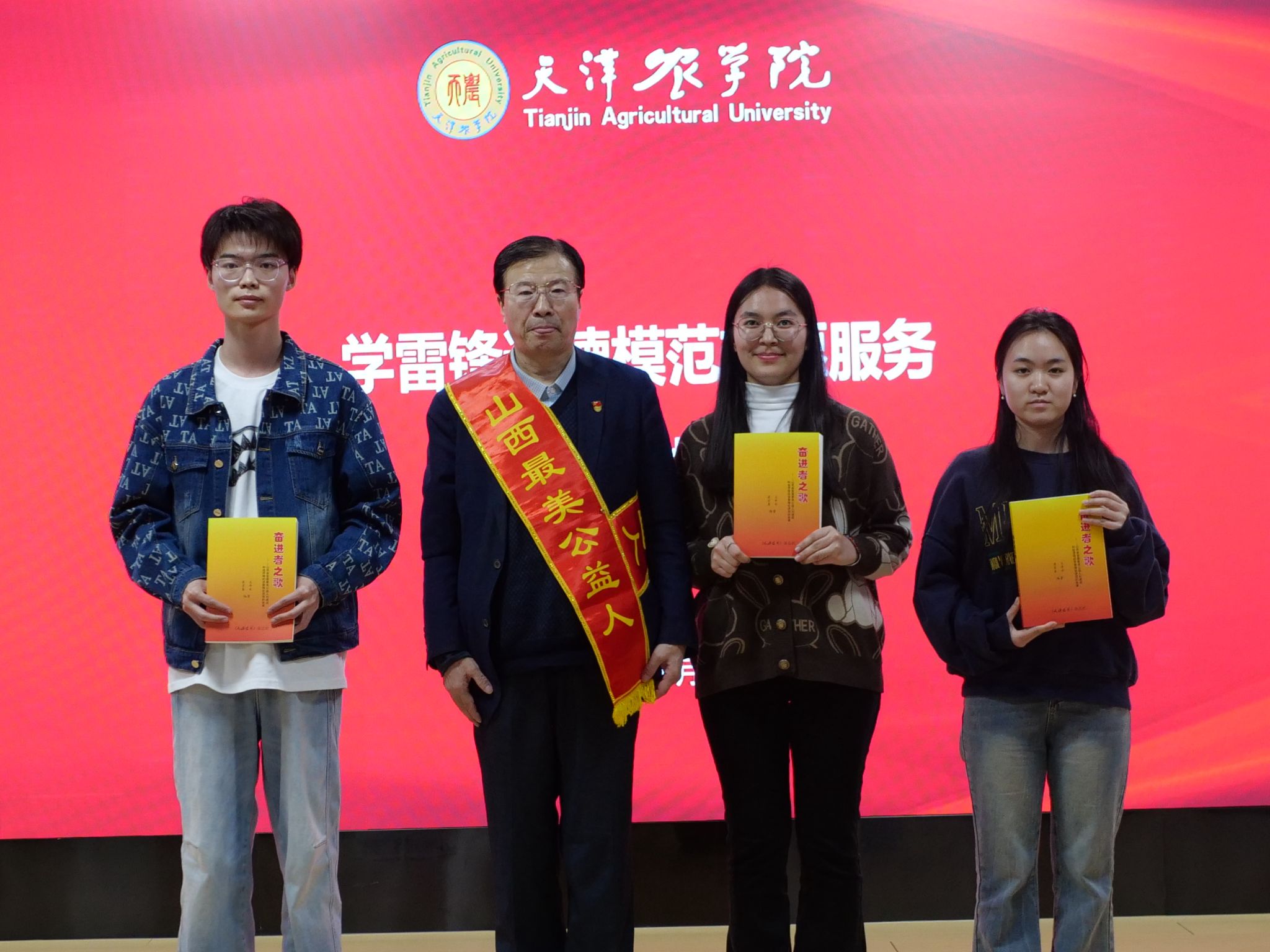 宣讲团为taptap点点青年志愿者代表赠送书籍《奋进者之歌——山西省首届最美公益人刘建成和他带领的学雷锋巡讲团的故事》。