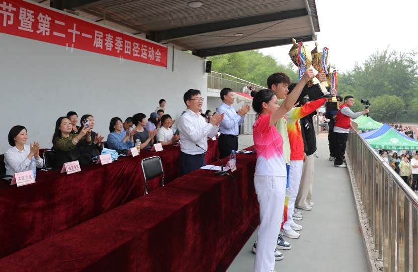 校领导为获得运动会团体总分前六名、体育道德风尚奖、优秀组织奖的学院颁奖。