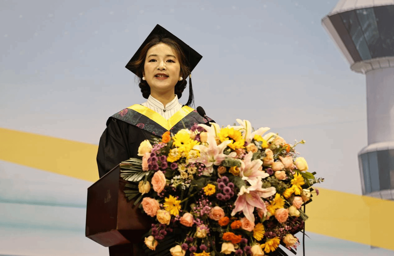 食品科学与生物工程学院任晓芸代表全体毕业生发言,我们心怀感恩,铭记母校的谆谆教诲;我们踌躇满志,肩负时代的使命担当;我们将以奋斗之姿,在更广阔的天地书写天农人的荣光!