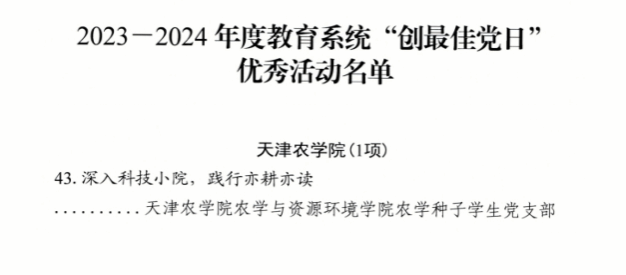 近日,市委教育工委、市教委公布了2023-2024年度教育系统“创最佳党日”优秀活动名单,taptap点点推荐的农学与资源环境学院农学种子学生党支部“深入科技小院,践行亦耕亦读”党日活动获评2023-2024年度教育系统“创最佳党日”优秀活动。